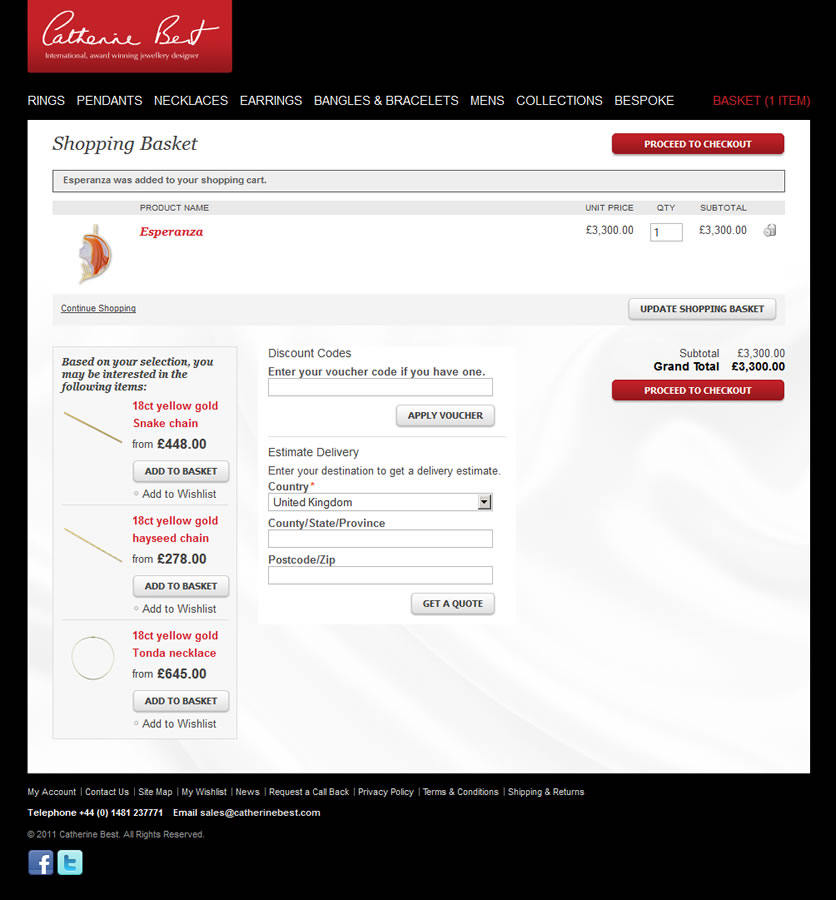 This Magento site had a really fast turn-around and I think everyone has been really pleased by the results. We are aiming for a high-end market and trying to make the most of the Jewellery. From a technical point of view the site uses Magento under the hood, but the product lists have been heavily customised to show large product images and use some flashy javascript to scroll through the product photos. The product pages themselves have also been customised significantly to provide a much simpler and cleaner view than a standard Magento page would provide but also to replace the standard photo zoom function with a nicer looking thumbnail/image arrangement. Once you start getting deeper into the eCommerce bits of the site it reverts to a slightly more Magento standard look and feel – because it works so well. Take a look at the gallery below for a closer look.